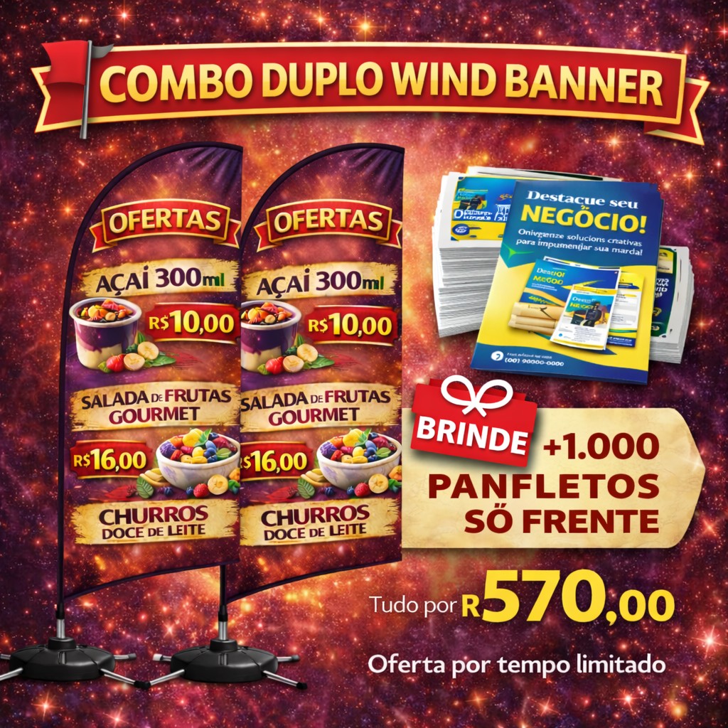 O Combo Duplo Wind Banner é uma oferta promocional voltada para negócios que buscam alto impacto visual e maior alcance de divulgação. Inclui 2 wind banners tamanho médio para fachada, calçada ou eventos, além de 1.000 panfletos só frente como brinde para distribuição. Indicado para lojas, lanchonetes, açaiterias, inaugurações e ações promocionais. A arte deve ser enviada pronta para impressão.