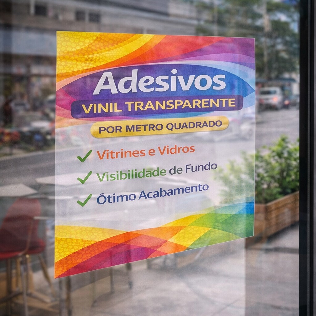 Adesivo produzido em vinil transparente, indicado para vitrines, vidros, portas, janelas e aplicações promocionais. Vendido por metro quadrado. Permite efeito de transparência com alta qualidade de impressão. Material resistente, com ótima aderência. A arte deve ser enviada pronta para impressão.