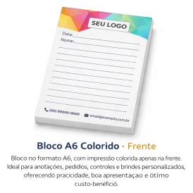 Bloco no formato A6, produzido conforme a necessidade do cliente, com impressão colorida apenas na frente (4x0). Indicado para anotações, comandas, controles internos, lembretes e ações promocionais. Material prático, funcional e personalizável. A arte deve ser enviada pronta para impressão.
