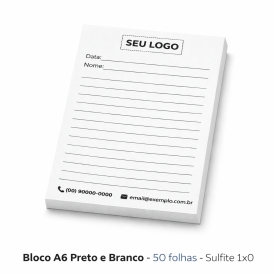 Bloco no formato A6, produzido em papel sulfite, com impressão em preto e branco apenas na frente (1x0). Indicado para anotações, comandas, controles internos, lembretes e uso comercial em geral. Material simples, econômico e prático para o dia a dia. A arte deve ser enviada pronta para impressão.