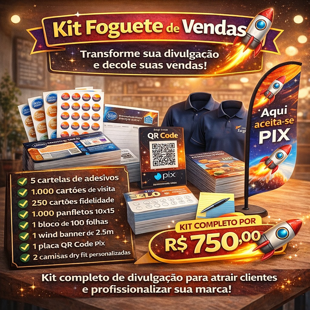 Kit completo de divulgação com materiais estratégicos para atrair clientes, fortalecer a marca e aumentar as vendas. Ideal para negócios que buscam visibilidade, profissionalismo e fidelização em um único pacote.