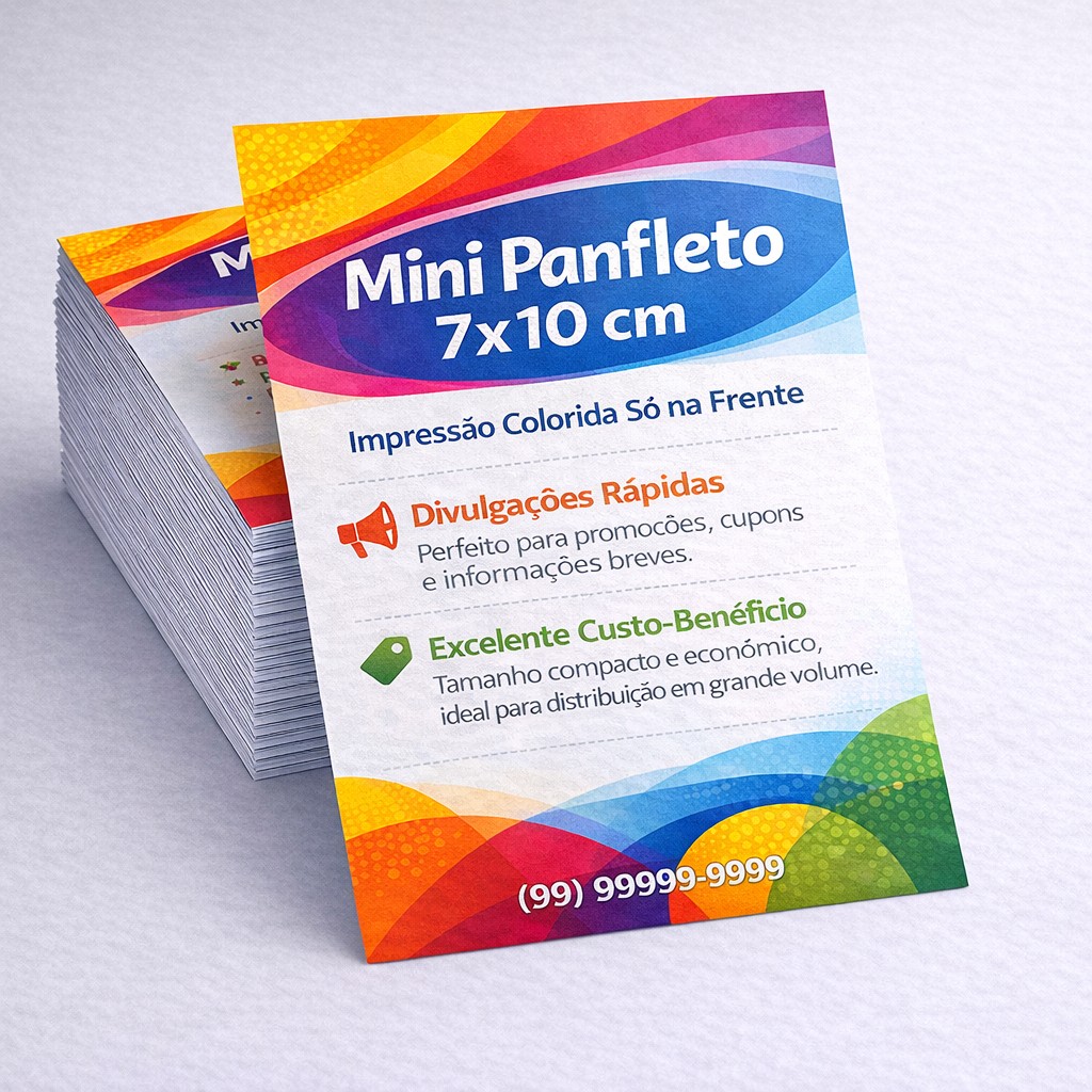 Mini panfleto no formato 7x10 cm, indicado para divulgação de promoções, cupons, eventos e informações rápidas. Impressão colorida apenas na frente (4x0). Material compacto, prático e econômico, ideal para distribuição em grande volume. A arte deve ser enviada pronta para impressão. Não acompanha verniz ou acabamentos especiais.
