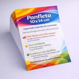 Panfleto no formato 10x14 cm, indicado para divulgação de promoções, eventos, produtos e serviços. Impressão colorida apenas na frente (4x0). Material prático, versátil e econômico, ideal para ações promocionais e distribuição em grande volume. A arte deve ser enviada pronta para impressão. Não acompanha verniz ou acabamentos especiais.