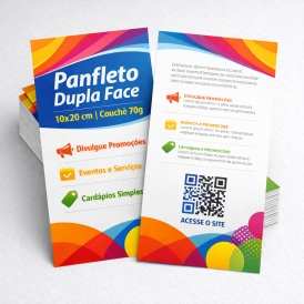 Panfleto no formato 10x20 cm, produzido em papel couchê 70g, com impressão colorida frente e verso (4x4). Indicado para divulgação de promoções, eventos, serviços e cardápios simples. Oferece melhor aproveitamento do espaço para informações, mantendo ótimo custo-benefício. A arte deve ser enviada pronta para impressão. Não possui verniz ou acabamentos especiais.